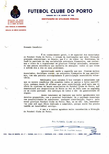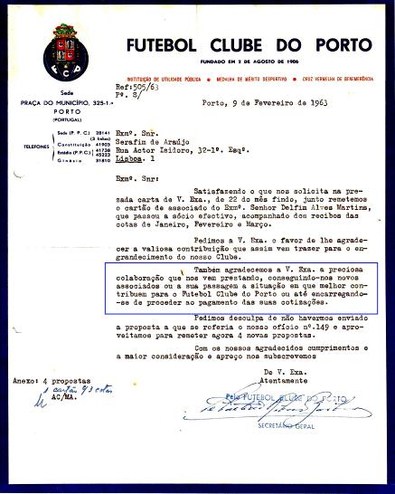 Apesar de a Primeira Casa do FCP em Lisboa já ter então deixado de existir, o meu Pai continua, em Lisboa, a apoiar incondicional e incansavelmente o FCP conforme a missiva anexa de 1963 documenta.