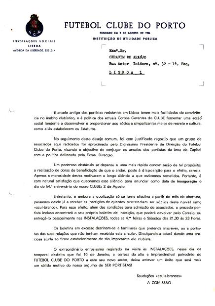 Os Portistas de Lisboa agrupam-se de novo em torno de um projecto que os leva à criação de uma Segunda Casa do FCP em Lisboa. Esta é carta-convite para Serafim de Araújo estar presente na inauguração marcada para o dia 2 de Agosto de 1970, ano em que pela contagem antiga o Clube completaria 64 anos após a sua alegada fundação em 1906 por José Monteiro da Costa. Na verdade seriam 77 anos, pois a sua fundação ocorrera antes em 28 de Setembro de 1893 por António Nicolau de Almeida, conforme veio a ser investigado por Rui Guedes, autor da Fotobiografia do FCP, investigação e conclusão essa posteriormente reconhecida e ratificada em Assembleia Geral. Esta Casa do FCP em Lisboa foi reconhecida como Delegação do Clube e veio a dar origem aos actuais DRAGÕES DE LISBOA já na vigência da Presidência de Jorge Nuno Pinto da Costa. |